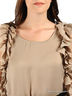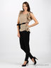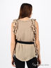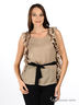 Нарядный топ прямого кроя из тонкой струящейся ткани. Округлый вырез горловины. Топ декорирован красивыми рюшами по бокам. На талии завязывается черная лента. Фигурный крой низа.