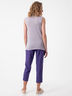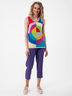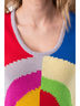 Яркий топ полуприлегающего силуэта цвета мультиколор. Топ выполнен в технике ручного вязания из натуральных нитей. Круглый вырез изделия и проймы рукавов обработаны двусторонней лицевой бейкой. По переду изделия выполнен рисунок в форме абстрактной геометрии. Аксессуары в комплект не входят.