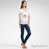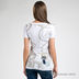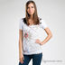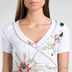 Удлиненная трикотажная футболка приталенного кроя. V-образный вырез. Короткие рукава. Горловина, манжеты рукавов и низа изделия на трикотажной резинке с декоративной строчкой. Полочка украшена бисером, пуговицами, бусинами и декоративной прострочкой.