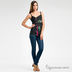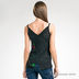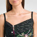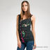 Удлиненный трикотажный топ, слегка приталенный. Тонкие лямки. На спине V-образный вырез с нахлестом. Оригинальный дизайн с множеством вставок и аппликаций. Украшен бисером, пуговицами и пайетками.