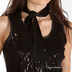 Эффектный топ с круглым вырезом горловины и воротником- стойкой, который переходит в декоративные хлястики, завязывающиеся в бант. Топ полностью украшен пайетками.