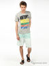 Футболка мужская классического покроя. Вырез горловины оформлен триотажной резинкой в мелкий рубчик. Изделие декорировано яркой надписью-аппликацией.