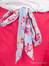 Трикотажная кофта свободного силуэта. Круглая горловина. Длинные рукава-реглан, манжеты на узкой трикотажной резинке. По низу изделия вшит пояс из цветастой ткани.