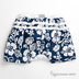 Модель прямого кроя. В пояс вставлена резинка и регулирующий шнурок. Вшиты трусики, мягкие изнутри, "клеенчатые" снаружи. Изделие украшено принтами в гавайском стиле.