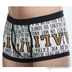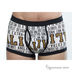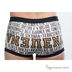 Трусы боксеры из слегка эластичной хлопковой ткани классического кроя. Сверху посажены на широкую резинку. Декорированы оригинальным принтом и контрастными вставками.