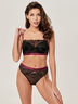 Трусики с актуальной высокой посадкой. Выполнены из мягкой сетки, расшитой изящными узорами из золотистого люрекса. Пикантные вырезы и пояс из атласной ленты винного цвета. Ажурный край без швов останется незаметным под одеждой.