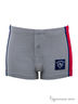 Трусы-шорты для мальчиков младшего возраста. Модель свободного силуэта и классической посадки с эластичным поясом запакованного типа. Изделие дополнено функциональным гульфиком с застежкой на пуговицу. Боковые детали оформлены вставками красного цвета и синими бейками. Передняя часть модели украшена логотипированной нашивкой.