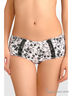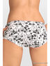 Трусы выполнены из принтованного сатина с растительным рисунком. Спереди два симметричных наклонных рельефа украшенных декоративной тесьмой с рюшей по краю. Спереди по центру украшение в виде маленького атласного бантика. Ластовица из хлопка.
