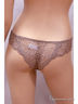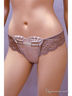 Трусы – стринги спереди выполнены из тонкой сетки с вышивкой. Вдоль верхнего края сквозь петли вышивки продета атласная отделочная лента. Спереди имеются наклонные симметричные рельефы. Боковые детали выполнены из мягкого кружева. Задняя кружевная деталь с центральным швом и симметричными наклонными рельефами. Ластовица из хлопка.