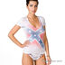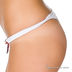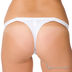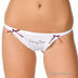 Стильные трикотажные трусики стринг белого цвета с принтом в виде надписи Denny Rose из страз. Спереди декоративные бантики из синих и красных ленточек.