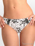 Трусы - стринги выполнены из принтованного сатина с растительным рисунком. Спереди два симметричных наклонных рельефа украшенных декоративной тесьмой с рюшей по краю. Сзади по центру вырез в виде небольшой капельки украшенной маленьким атласным бантиком. Ластовица из хлопка.