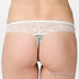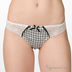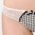 Романтичные трусики-стринг из мягкого атласа с принтом. Боковинки выполнены из эластичного кружева, которым украшена и задняя часть трусиков. Спереди трусики декорированы маленьким атласным бантиком с бусинками под "мелкий жемчуг" и ажурной тесьмой черного цвета.