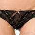 Маленькие и изящные трусики-стринг из тонкой сеточки. Боковые детали выполнены из эластичного кружева. Передняя часть имеет хлопковую подкладку коричневого оттенка, декорирована шитьем, ажурной тесьмой, атласными лентами и бантиком кофейного оттенка.