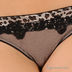 Трусики V-стринги с чувственным леопардовым принтом. Выполнены из эластичного кружева. Спереди сетчатая вставка с хлопковой подкладкой телесного цвета.