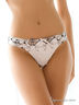 Трусы – стринги из принтованной микрофибры с наклонными рельефами на передней детали. Центральная часть передней детали выполнена из микрофибры с настроченной вышитой сеткой. По середине передней детали украшение в виде бантика из атласной ленты. Ластовица из хлопка. Задняя деталь гладкая классической формы, выполнена из эластичной микрофибры.