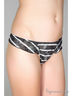 Трусы-стринги выполнены из тонкого жаккардового трикотажного полотна. Спереди по центру два симметричных вертикальных рельефа. Нижний край боковых деталей обработан на микрооверлоке. Сзади треугольный вырез. Нижние края задней детали обработаны на микрооверлокев виде рюши. Ластовица из хлопка.