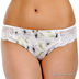 Оригинальные трусы стринги выполнены из тонкой эластичной ткани с хлопковой подкладкой и кружевного материала. Декорированы оригинальным принтом.
