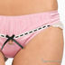 Атласные трусики стринги нежного розового цвета. Спереди вставка из жатого материала. Декорированы ажурным кружевом.