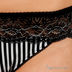 Оригинальные трусы стринги выполнены из тонкой эластичной ткани с кружевными вставками. Ластовица на хлопковой подкладке. Декорированы оригинальным принтом - полоска.