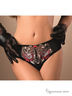 Трусики-стринги черного цвета, спереди большая вставка из цветного кружева.