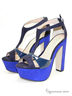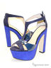 Роскошные босоножки на высоком каблуке и платформе. Верх оформлен ремешками из высококачественного нубука темно-синего цвета и лака в цвет верха. Обтяжка каблука и платформы - нубуком ярко-синего цвета. Подкладка и уплотненная стелька изготовлены из кожи. Для удобства одевания - сзади имеется молния .Подошва: тунит.