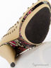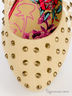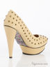 Текстильные однотонные туфли на высоком каблуке и танкетке, декорированы железными заклепками. Подошва и стелька украшены цветочным принтом-аппликацией и надписью с логотипом бренда.