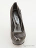 Туфли из ткани золотистого цвета , украшенные ремешком с металлической пряжкой со стразами и вышивкой с пайетками. Каблук-шпилька (12см), платформа (3см).