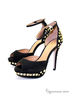 Отличный способ заявить о себе - ультрамодные туфли от KLIMINI! Черные туфли из натурального нубука, украшенные металлическими элементами - примечательный вечерний вариант. Удобная колодка позаботится о комфорте, а высокая платформа - поддержка для эффектной шпильки. Кожаные подкладка и стелька обеспечат качественную теплорегуляцию и необходимый воздухобмен.Подошва:тунит.Высота каблука ок.12,5см,высота плато ок.2,5см.Рекомендуем подбирать обувь больше на размер. Произведено в Бразилии.