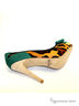 Яркие женские туфли с заостренной формой мыса от Klimini. Довольно интересный верх модели исполнен из комбинации натуральный материалов- короткостриженного меха под лоеопард и нубука изумрудного цвета.Впереди -декор в виде бантика и металлической фарнитурой,сзади - элемент из нубука контрастного цвет.Внутри стелька и подкладка из натуральной кожи. Высокий каблук компенсируется небольшой скрытой платформой.Подошва:тунит.Высота каблука 11,5 см.Рекомендуем подбирать на размер больше.Произведено в Бразилии.