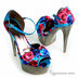 Замечательные женские туфли от Carvela на высокой шпильке и толстой платформе серого цвета. Выполнены из яркого разноцветного текстиля. Цветочный принт представлен различными оттенками розового и синего. Сверху туфли удобно застегиваются на тонкий ремешок.