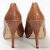 Оригинальные туфли из глянцевой кожи под крокодила. Невысокий каблук, скрытая платформа, подошва без протекции, открытый мысок с кожаной вставкой.