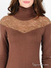Детали: ворот-гольф из рибаны, длинный прямой рукав-реглан, полочка и спинка декорированы гипюровым кружевом