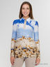 Туника-рубашка цвета неба принесет небесное настроение. Модель с длинными рукавами, отложным воротником и короткой застежкой на молнию. Изделие приталенного покроя, декорировано контрастным принтом.