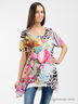 Кофта с короткими рукавами и округлым вырезом горловины. Изделие выполнено из легкой, принтованной ткани контрастной расцветки. Отличный вариант на каждый день.