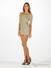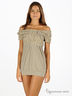 Туника прилегающего кроя из мято-жатой ткани. Широкий овальный вырез горловины. Короткие рукава. Верхняя часть перетянута несколькими резинками, декорирована двумя цветами из ткани. Нижняя часть изделия свободная.