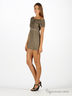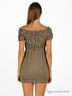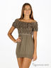 Туника прилегающего кроя из мято-жатой ткани. Широкий овальный вырез горловины. Короткие рукава. Верхняя часть перетянута несколькими резинками, декорирована двумя цветами из ткани. Нижняя часть изделия свободная.