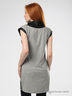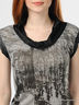 Легкая трикотажная туника меланжевого серого цвета с оригинальным принтом на полочке. Широкая круглая горловина с воротником хомут из эластичного лоснящегося материала. Короткие цельнокройные рукава с манжетами.