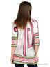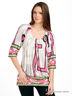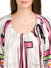 Туника свободного кроя с манжетом по нижнему канту, с широкими рукавами длиной 3/4, открытой зоной декольте, собранным на резинку и на шнур, декорирована геометрическими фигурами и ярким цветочным принтом.