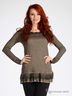 Стильная трикотажная туника с длинным рукавом и округлым вырезом горловины. Низ изделия слегка расклешен. Вырез украшен пришитой тесьмой с ворсистым кантом, низ оформлен пришитым воланом в складку.