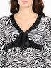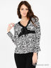 Детали: v-образный вырез горловины присборен на резинку и декорирован атласной лентой с бантом, длинный прямой рукав, втачной пояс на резинке