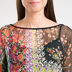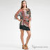 Туника состоит из двух частей: верхняя тонкая легкая креп-шифоновая ткань жатой фактуры пестрой расцветки, нижняя тонкая трикотажная ткань зеленого цвета. Верхняя часть туники из крепа имеет цельнокроеный рукав, округлый вырез горловины. Нижняя туника из трикотажа на тонких бретелях. Обе части соединены швом по линии бедра и присборены на резинку.