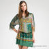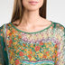 Туника женская зеленого цвета. Туника состоит из двух частей: верхняя тонкая легкая креп-шифоновая ткань жатой фактуры пестрой расцветки, нижняя тонкая трикотажная ткань зеленого цвета. Верхняя часть туники из крепа имеет цельнокроеный рукав, округлый вырез горловины. Нижняя туника из трикотажа на тонких бретелях. Обе части соединены швом по линии бедра и присборены на резинку.