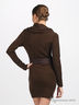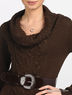 Вязанная туника прямого кроя. Ворот-хомут. Длинный рукав и низ изделия на трикотажной резинке в рубчик. Полочка декорирована ажурной вязкой "косичка". Туника дополнена эластичным поясом с лаковой пряжкой.