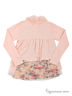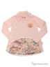 Очаровательная туника свободного покроя с длинными рукавами и округлым вырезом горловины. Низ изделия дополнен контрастной вставкой. Модель декорирована рюшами по горловине и декоративным цветком на груди. Отличный вариант для детского гардероба.