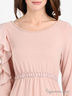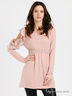 Детали: округлый вырез горловины, длинный рукав, левый рукав с вырезом декорирован тканью и открывает плечо, диния талии подчеркнута резинкой и пришитой кружевной лентой