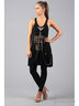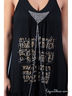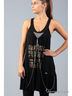 Детали: туника на широких лямках, с лицевой стороны изделие украшено оригинальным принтом, крупными стразами и свисающими по бокам серебряными цепями, низ в виде крестьянской юбки.