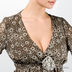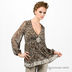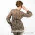 Стильная туника в стиле ампир с V-образным вырезом горловины и длинными рукавами. Вырез горловины украшен розой. Завышенная линия талии "посажена" на резинку, сзади поясок. Низ туники украшают воланы.