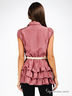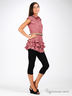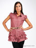 Приталенная туника из лоснящегося, шелковистого материала. Отложной воротник на стойке. Короткие рукава-фонарики на резинке. Застегивается на планку с пуговицами. Низ изделия слегка расклешенный, декорирован оборками. В комплект входит текстильный ремень с кожаными вставками и металлической пряжкой.