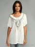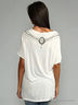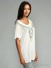 Трикотажная однотонная туника свободного кроя, с короткими рукавами, отложным воротом и глубоким вырезом горловины. Модель декорирована сборкой, закрепленной брошью из страз, на одном боку, и украшением в виде бус по вороту.