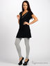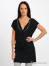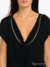 Однотонная туника с круглым глубоким вырезом в легкую сборку. Изделие украшено металлической цепочкой декорированной стразами.